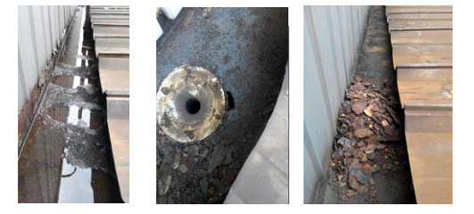很多钢板天沟,使用至今已有10多年时间,由于生产车间常年排放的废气及粉尘,含有化学腐蚀作用,导致屋面天沟区域内腐蚀严重,且大量堆积了淤泥垃圾,细铁砂等物质,这几年已出现多处渗漏水情况,对生产车间造成安全隐患(如配电箱/焊接设备/成品等)。